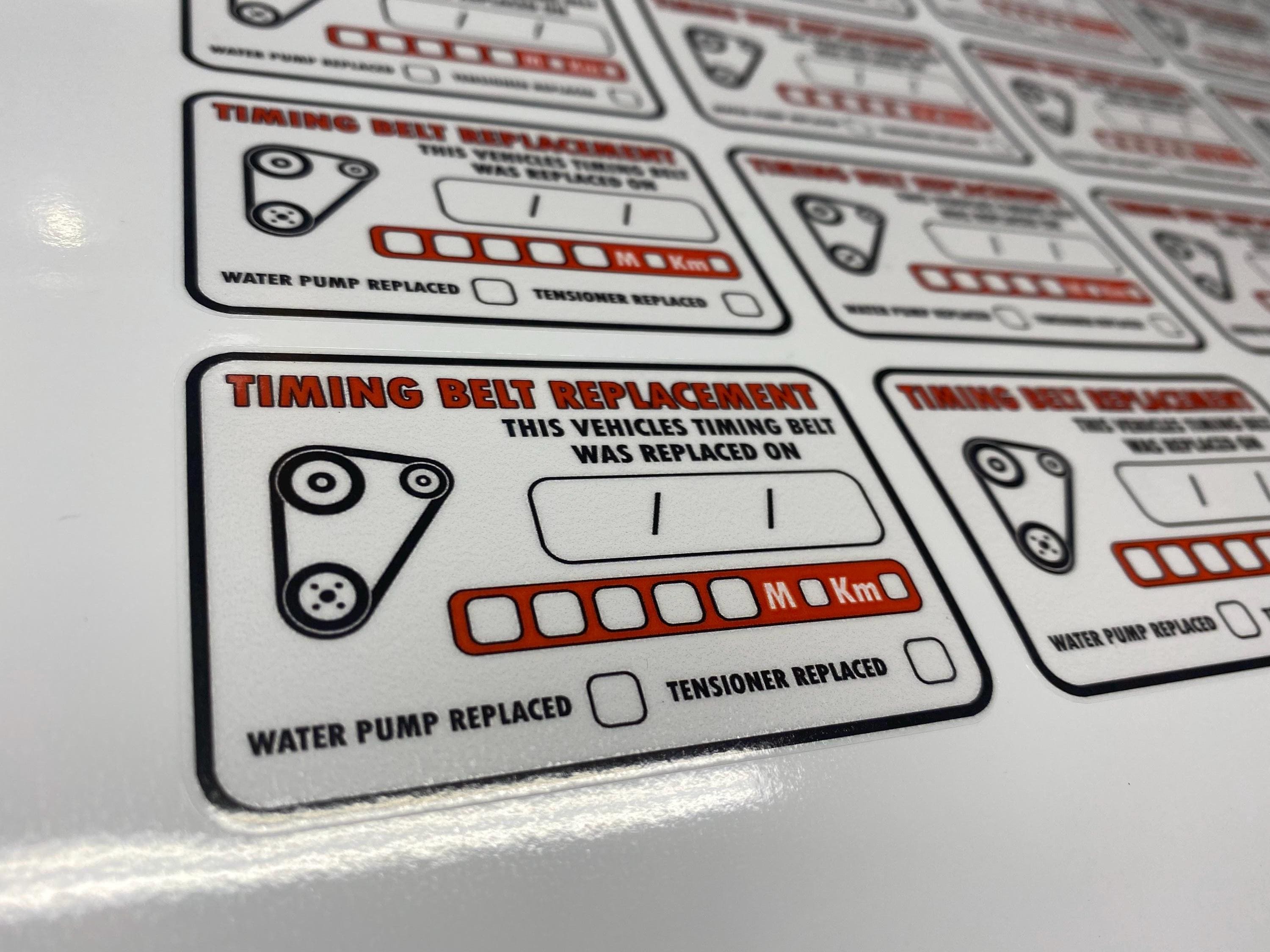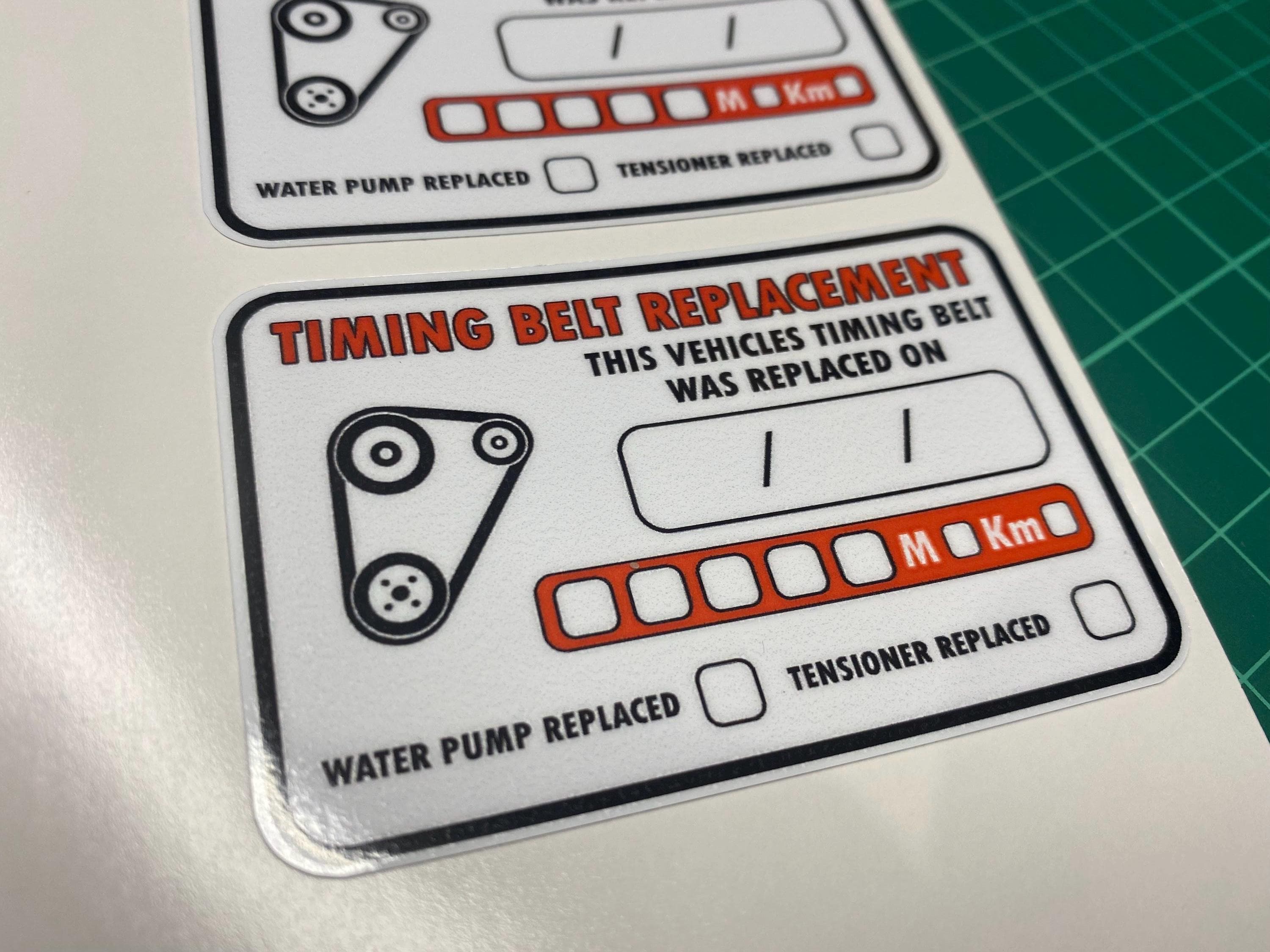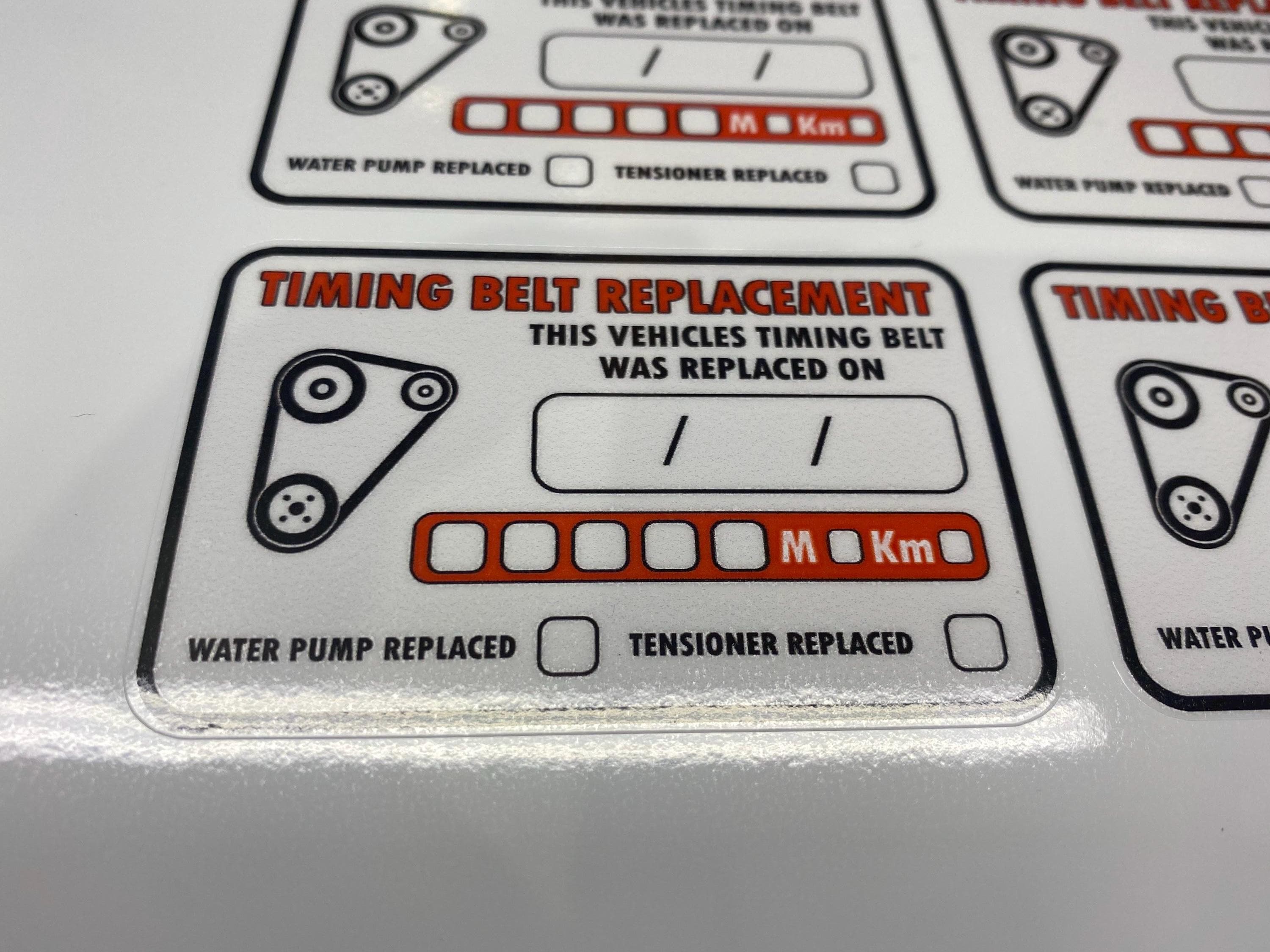 Timing belt replacement vinyl stickers x 3 decal car garage mechanic laminated